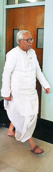 | Chief minister Buddhadeb Bhattacharjee strides into Writers’ Buildings during the Left trade union-sponsored bandh on Thursday. Picture by Pradip Sanyal |