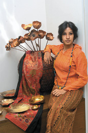 Her skirts in raw silk embellished with metal coins and patchwork are bright and funky.