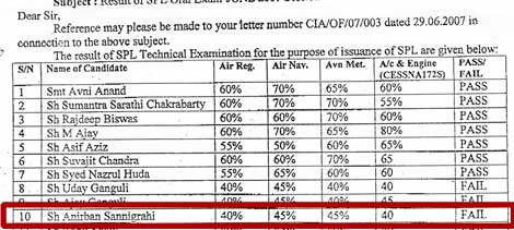 But the results of a preliminary test conducted in June 2007 (see picture) by the directorate general of civil aviation (DGCA) and the Behala institute show that Anirban wasn’t eligible to be a student pilot, let alone a licensed one.