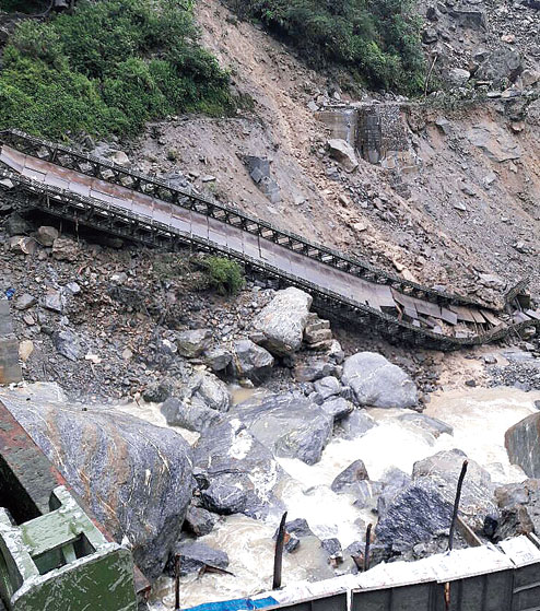 The bridge on the North Sikkim Highway has North District headquarters, Mangan, on one side and Chungthang on the other. Around 50 tourists from Bengal, Gujarat and Delhi are accommodated at hotels in Lachung and Lachen. They had gone to visit Yumthang valley and Gurudongmar lake in the North District and will return on Monday after sight-seeing.