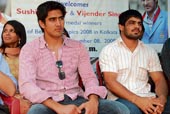 | Vijender Kumar (left) and Sushil Kumar at Purushottam Bhagchandka Academic School in Tollygunge on Monday morning. Picture by Anindya Shankar Ray |