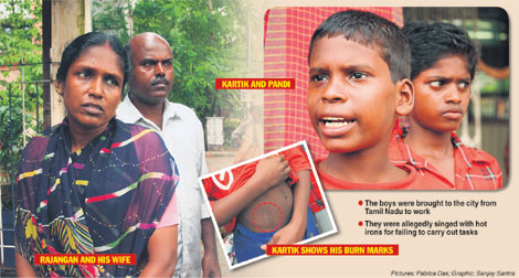 Kartik said he and Pandi were severely beaten up by Rajangan and his wife. They were even singed with hot iron rods. ?They gave us food only once a day and if we asked for food at night, they abused and beat us,? sobbed Kartik.