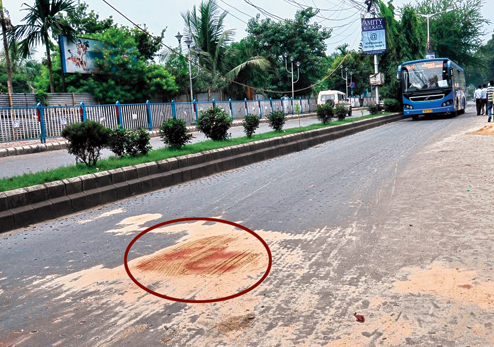 | The spot (circled) near the SDF crossing in Sector V where the accident occurred on Wednesday afternoon. The pile of sand on which Pradip Maity’s bike skidded had been removed when this picture was taken. (Mayukh Sengupta) |