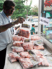If the chief minister has said it, there is no chickening out. Two days after Mamata Banerjee promised to put chicken on every plate, a stall selling forest and animal resources development department products at Writers’ Buildings stocked up on frozen chicken. Each 500gm packet of dressed chicken was sold at Rs 75. Chicken prices have spiralled to Rs 170-180 in markets across the city over the past week. First-day sales at the government stalls were, however, not impressive. “Many people are sceptical about buying frozen products. Moreover, if we buy chicken from here, where do we keep it during office hours? Many of us travel long distances by train or bus. The chicken could get spoilt,” said Runa Das, a government employee. The response at a mobile outlet (picture left) in Esplanade was equally lukewarm. The van parked in front of Esplanade Metro station from 1pm to 3pm drew many curious onlookers but few customers. The government will also sell chicken at other markets across the city. Picture by Pradip Sanyal