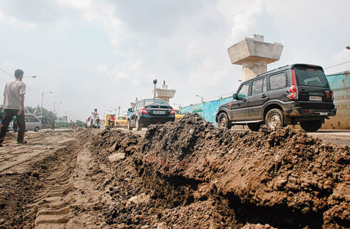 The Garia-bound flank between Panchannagram and the Ruby rotary has rough stretches where the top layer has worn off and stone chips were scattered all along the road. Some of the service roads, especially the one in front of the passport office, bear no semblance of a tarred road.