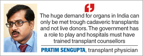 "The huge demand for organs in India can only be met trough cadaveric transplants and not live donors. The government has a role to play and individual hospitals must have trained transplant counsellors. But it is also important to spread awareness about the issue from before so that it becomes easier for the counsellors to convince the relatives of the patient when a brainstem death occurs," said Pratim Sengupta, transplant physician and nephrologist at Belle Vue Clinic and president of The Kidney Care Society.