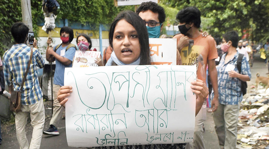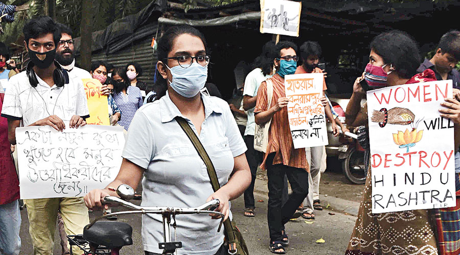 Students at Jadavpur University and several other institutions marched through rain on Tuesday evening to protest the alleged gang rape and murder of a Dalit woman in Hathras, Uttar Pradesh. Many came on cycles — to avoid using public transport amid the Covid pandemic — to protest an incident that they said had “shaken” them. Metro spoke to some of the marchers