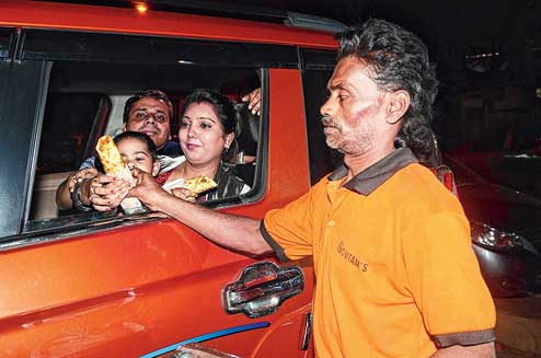 ♦ Foodie bite: “Sometimes the weather, ambience and people outside are such fun that you’d rather eat there than go inside a formal restaurant,” said Pankaj Jadhav, who was eating pulao that had been served on his car’s boot.