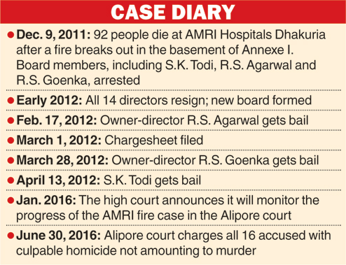 Twelve erstwhile directors and four officials of AMRI Dhakuria were on Thursday charged with culpable homicide not amounting to murder, setting in motion the process of bringing to trial those blamed for the hospital blaze on December 9, 2011, that took 92 lives.
