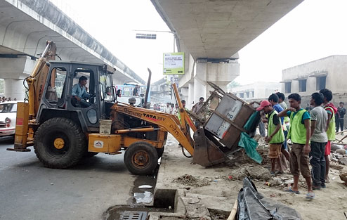 The Bidhannagar Municipal Corporation undertook yet another eviction drive on Tuesday afternoon. Two corporation trucks and a backhoe loader cleared pavements from near the Karunamoyee international bus terminus to beneath the elevated Metro corridor near City Centre.
