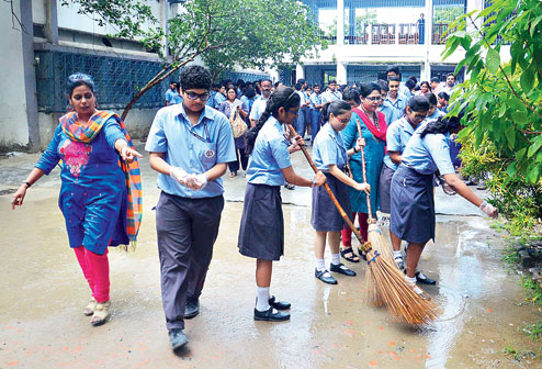 Students of Salt Lake School picked up brooms at a cleanliness drive on campus recently. It was a part of a dengue awareness campaign by the school and students left no corner uncleaned.