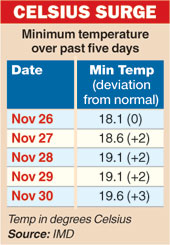 According to the forecast, the minimum temperature would climb to 20 degrees Celsius on Thursday and stay around the same mark at least till Saturday, when the cyclone is likely to dissipate.