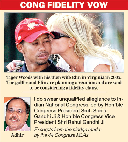 Calcutta, May 24: Tiger Woods and his former wife Elin, who are considering reunion, are said to be mulling a prenuptial agreement that would include a $350-million anti-cheating clause, considering the golfer's philandering ways. Closer home, the Congress has come up with a fidelity clause to keep its flock of 44 MLAs to the straight and the narrow.