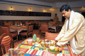 | (From top) A full-course Bengali meal being laid out at Aaheli at The Peerless Inn; Bhaichung Bhutia with his wife Madhuri at 6, Ballygunge Place; a chef whips up some Bangla delights at Aaheli. Pictures by Rashbehari Das |