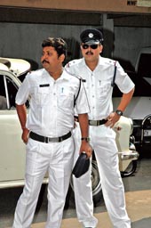| Sub-inspectors Jayanta Mukherjee and Pulak Dutta arrive at Bhabani Bhavan. (Bottom): Trinamul Congress MLA Javed Khan before his questioning by CID sleuths on Thursday. Pictures by Sanat Kumar Sinha |