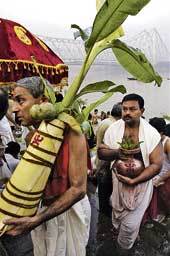 The most important ritual of Saptami is the bathing of the nabapatrika, a collection of nine plants, which represents Durga as a goddess of vegetation. The bathing should take place preferably in the Ganga.
