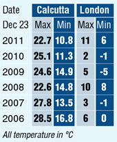 London’s weather has apparently become warmer and Calcutta’s colder than normal this winter to set up the possibility of a grand Christmas union at the stroke of 10 degrees Celsius.
