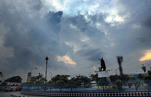 | Clouds envelop the sky over Red Road against the backdrop of Netaji’s statue and the Eden Gardens on Tuesday evening. Picture by Sanat Kr Sinha |