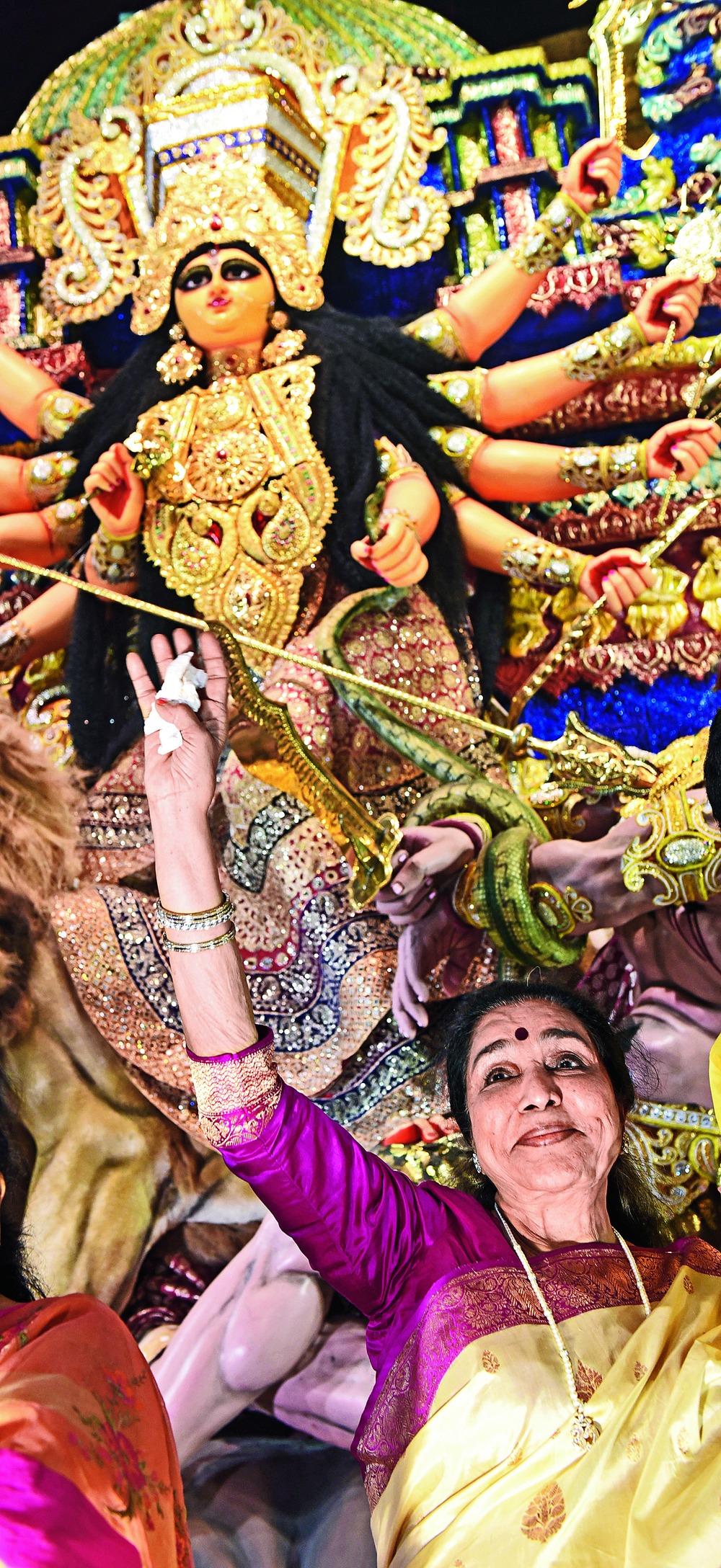 Her Puja releases have played incessantly at pandals across Bengal but "Bangal ki bahu" Asha Bhosle had never seen Durga Puja here. Her wish was granted when she walked into the Sreebhumi pandal on Thursday night. She was accompanied by grandson Chintu, family friend Mili Bhattacharya and Mahua Lahiri of Asha Audio. "She was very excited at the prospect of coming to Durga Puja. She landed in Calcutta straight from a concert in South Africa via Mumbai," Chintu told Metro. His grandma was then seated in front of the idol, blissfully watching arati. Then she offered incense to each deity and touched the priest's feet, before partaking of prasad.The experience left her visibly overwhelmed. " Keu dharona korte parbe na eto sundar.