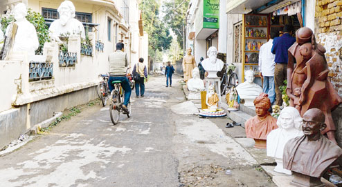 | A street in Ghurni, the doll-making hub of Krishnagar, lined with workshops and shops, many of which now sell busts of famous personalities. Pictures by Bhubaneswarananda Halder |