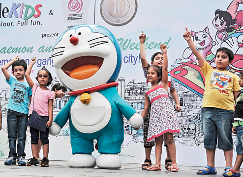 | Children dance to the Doraemon theme song with their favourite feline at Doraemon and Friends Weekend presented by Telekids and City Centre Salt Lake on Saturday. Not only is the super cute robotic cat back in town for the weekend, he has brought with him an array of activities for his little fans. From meet-and-greet opportunities and photo-ops with Doraemon to a tattoo corner, from a bowling alley to a bouncy castle, the Kund area of City Centre Salt Lake is abuzz with fun. And if all the activity makes the kids hungry, they can gorge on Dora cakes while their parents feast on Japanese food at Wasabee. “Doraemon is so helpful and so cute. I like him and his gadgets. He has such awesome gadgets. I would like to have the Anywhere Door and fly away on a Take-copter,” said Dighvij Chirimar, a Class III student at St. James’ School, who got a Doraemon tattoo on his arm. Doraemon and Friends Weekend is open at City Centre Salt Lake on Sunday, from noon to 9pm. Picture by Chanchal Ghosh |