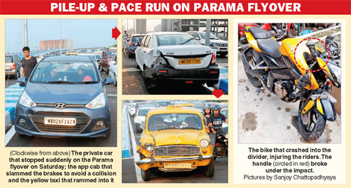 Two youths on a bike speeding down the Park Circus-bound flank of the flyover were injured when their vehicle lost control and rammed into the divider near Viswakarma Building around 8.30am. In the evening, there was a pile-up involving three cars but the damage wasn't grave because a snarl had already slowed down traffic.
