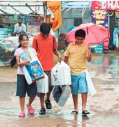 | Youngsters brave the shower on Sunday afternoon to shop for fireworks at the deserted Bazi Bazar on the Maidan. Picture by Sanjoy Chattopadhyaya |