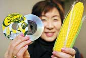 | A JVC employee displays 8 cm DVDs made of vegetable-based plastic. The environmental-friendly discs were developed using polylactic acid, extracted from corn starch. (AFP) |