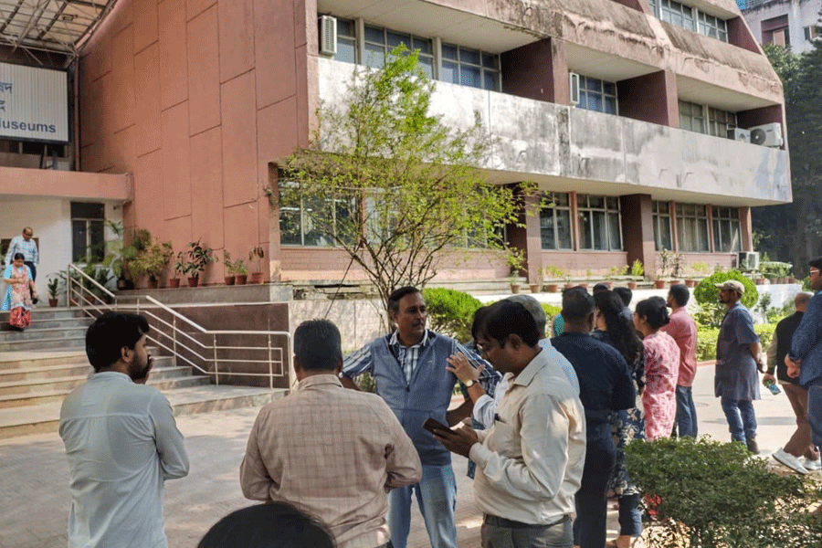 Office employees have left their office and taken to the streets in fear of the earthquake at Sector V on Friday morning. Picture by Amit Datta.