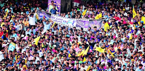 What they saw overwhelmed them. As Robin Uthappa greeted the Afghan leg spinner, Rashid Khan, with a six over long on, Eden erupted. The trademark Korbo, Lorbo, Jeetbo track played and the 60,000 plus crowd started swaying as they waved tens of thousands of purple and gold, and yellow flags.