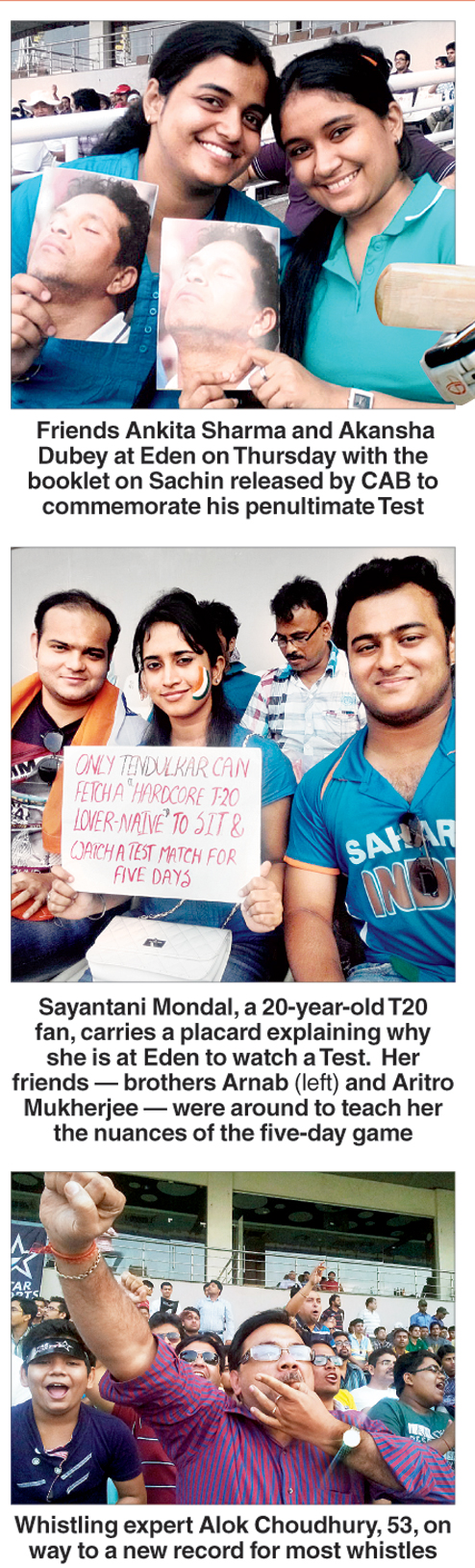 From the Eden veteran who whistled away the Sachin setback to the two friends who came up with puns and posters every few overs, the stands weren’t short of characters to keep the fun alive till stumps on Thursday.