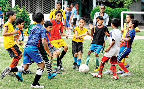 | Budding footballers practise at Avenue Sammelani Club in Rabindra Sarobar Stadium on Sunday, many of them trying to replicate skills seen in Euro 2012. Picture by Pabitra Das |