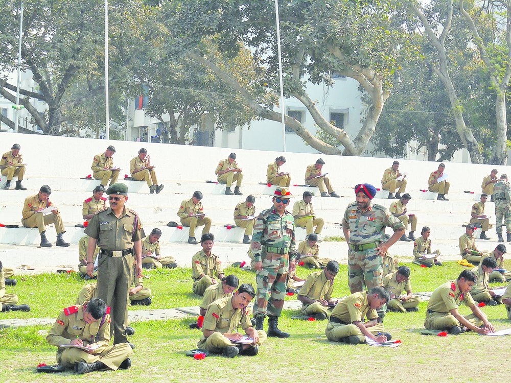 NCC cadets appear for the B certificate examination at Fort William in Calcutta on Sunday. The cadets get training for joining the armed forces. This year’s focus is on girl cadets
