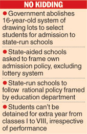 The Right to Compulsory and Free Education Act, which states that no student should be denied admission between classes I and VIII, was then cited as a reason to consider extending the lottery system to the 15,000-odd state-aided schools.