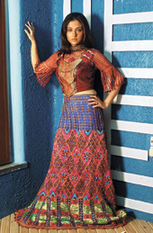 Provided by antique crochet, patchwork and ruffled antique tissue on lehngas that hug the hips and flare at the hem line. The departure from the conventional bias-cut lehnga with more body required a corset-style choli to team it with.