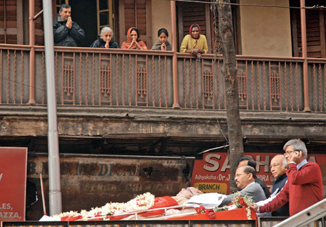 As the hearse rolls out, passers-by are pushed to the pavements. Basu’s aide Joykrishna Ghosh is in the front seat with the driver.