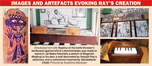 The couple have got replicas made of iconic props used in the stories. In a showcase, there is a melochord, with the German maker Spiegler's logo. On this, Feluda had played the notes making up Radharaman Samaddar's name to reveal his hidden savings in Samaddarer Chabi.