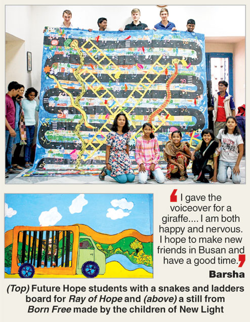 A similar workshop was conducted with around 30 children of Future Hope School and the result was an animation music video, Ray of Hope, on drug addiction. “The participants were mostly kids whose parents work in leather factories and tanneries. Many of them are exposed to or are victims of substance abuse from a very early age. So we tried to show the dangers of addiction through the game of snakes and ladders. The snake represents the life of an addict while the ladder is what one can climb if he/she stays clean,” explained Sayak, the lead vocalist for Lakkhichhara. Ray of Hope is also slated for a screening at BiKi.