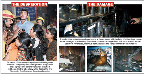 The fire, first noticed in a lift and the first-floor laboratory of the zoology department at 5.45pm, quickly spread to the museum adjacent to it, charring exhibits collected since 1914 by teachers and students of Ballygunge Science College.