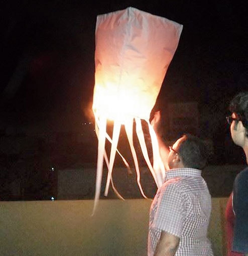 After last year’s success, many friends came across the photograph in The Telegraph Salt Lake and reprimanded me for not inviting them. So, this year, invitations went out over phone, Facebook and Whatsapp and we had a group of 30 at the launch. As two of my cousins held up the first lantern, I applied the fire to the fuel. After some nudges, the lantern took off and flew steadily upwards till it was just a dot in the sky. The cameras went click-click and there were plenty of high-fives and clapping all around. The second lantern was launched similarly but after floating a bit, one of the walls caught fire and it did not fly like the first one. Everyone left satisfied and after extracting a promise from me to continue this in the coming years.