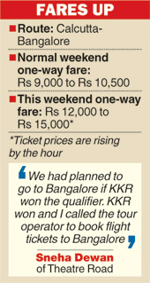 “This is like a festival rush. The spike in demand was abrupt, starting late on Wednesday. Fans were probably holding on to their plans till KKR won and made a direct entry into the final. By next evening, most of the Bangalore-bound flights for Saturday evening and Sunday morning were almost fully booked,” said Anil Punjabi, chairman (east) of the Travel Agents’ Federation of India.