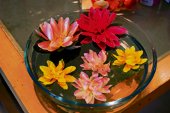 Made of a special silk that makes artificial plants and flowers look almost real, floating flowers are available as single pieces, in packs of twos and fours and even in petal form. The colours are bright and vibrant ? pink, yellow, green and violet.