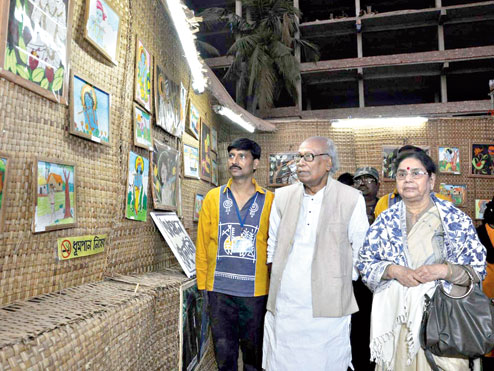 Poet and advisor to Nicwon Centre for Performing Arts, Sankha Ghosh, arrived with his wife at 5pm on Day Three of the fair which was a Saturday. The fair is part of the Centre’s annual events. Ghosh was first led to see the posters that decorated the outer boundary wall of the fair. Right at the entrance to the fair ground was an exhibition of drawings and paintings done on the theme by students of Nicwon Centre for Performing Arts. Sankha Ghosh took time to look at these as well.