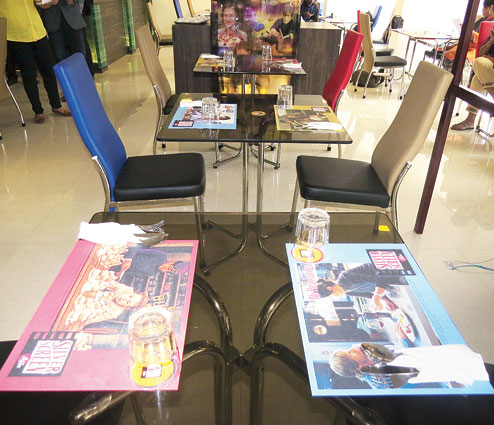 “I have always been passionate about food and films,” smiled Sengupta, a veteran of two decades in the hospitality industry. “We have taken the food-inspired moments in iconic films like Sarey Chuattor, Goopi Gyne Bagha Byne, The Hundred Foot Journey, Julie and Julia, Ratatouille etc as our theme.” The place mats as well as the glass fronts of the pillars therefore carry the relevant scenes from such films.
