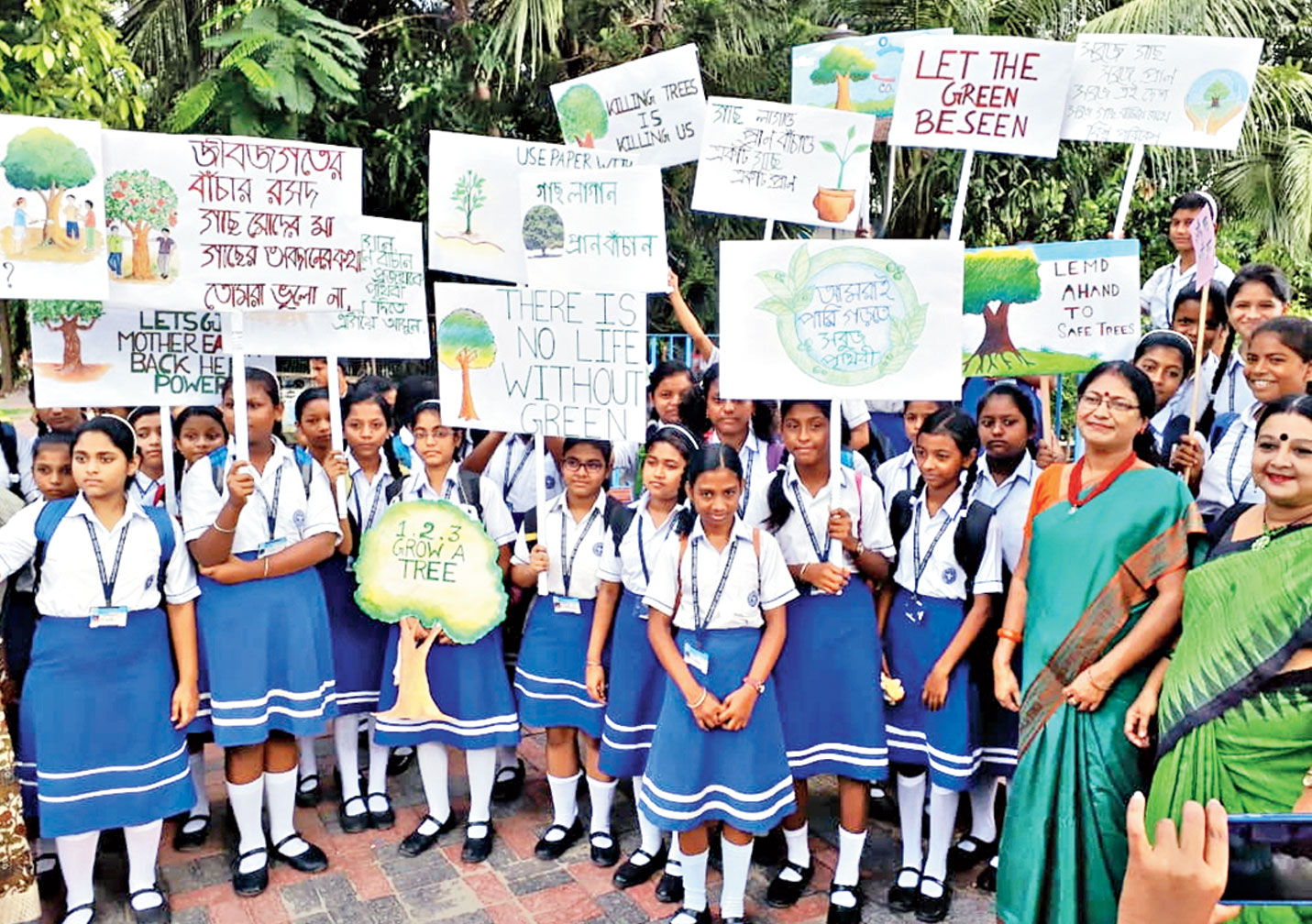 Over 60 students of the AE Block school Bhagabati Devi Balika Vidyalaya, along with their teachers, guardians, members of the society and nature lovers, walked from Netaji statue to BC Block community hall. They held up pro-greenery posters and sang songs of nature and the monsoon on the way.