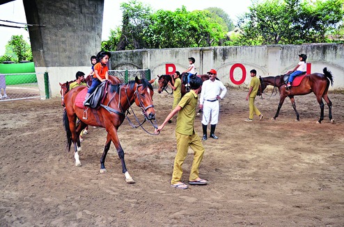 Students of La Martiniere for Girls enjoy a play date at the Calcutta Polo Club stables on Saturday. Sixty-odd children aged four to six were taught the basics of horse riding and polo besides getting a chance to pet the horses.