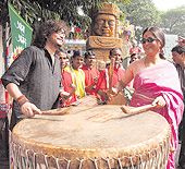 | Fossils frontman Rupam and actress Churni Ganguly, judges of CESC The Telegraph True Spirit Puja, get into the festive spirit at the 41 Pally puja in Haridevpur as the Inca-style figures at the pandal look on. Picture by Pabitra Das |