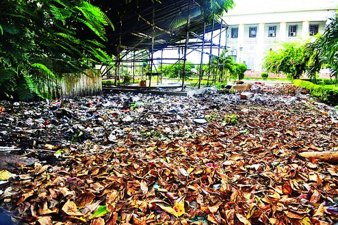 The compound of the Assembly was strewn with garbage on Sunday, a sight that made a mockery of the government's attempts at spreading awareness on how accumulation of garbage can lead to a spurt in dengue. "A PWD team usually cleans the Assembly premises every day," speaker Biman Banerjee said."I will inquire into it. Maybe the premises have not been cleaned since Friday evening because Saturday