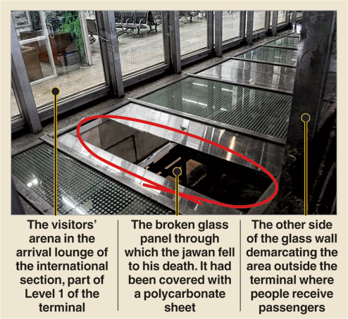 Sources said the glass panel broke a long time ago - in 2013, according to some - and was never repaired. "The walkway is mostly used to place mechanised ladders that the housekeeping staff use to scrub and clean the glass façade. The polycarbonate sheet had been placed to ensure that if any cleaning tool slipped out of a worker's hands, it wouldn't fall to the basement through the gap. The workers knew about it and so wouldn't step on the sheet," a senior airport official said.