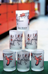 The glasses by themselves are quite small though, holding only about half a peg. If you want to improvise upon the idea, get bigger plain frosted glasses, some glass paints, and get cracking. Just an idea, but the do-it-yourself spirit can help you personalise each glass to match the mood of the moment.